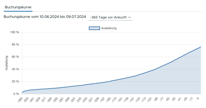 The graphical representation of occupancy over time is known as the booking curve and can be seen in the following diagram. By continuously comparing OTB data with our forecast, the algorithm regulates itself and adjusts the prices to your guests' willingness to pay.