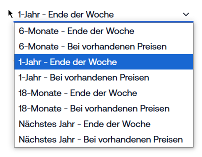 Example: If you select a duration of one year ‘until the end of the week for the price adjustment, prices will be generated until 7 November 2025 (assuming that the current day is 5 November 2024).